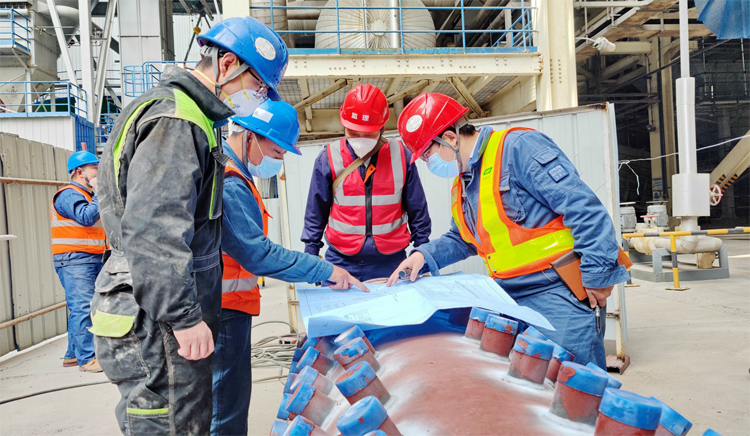 淮沪煤电公司田集电厂在做好疫情防控的同时,坚持做好安全发电工作,一手抓计划检修,2、4号机组检修工作安全高效推进;一手抓稳定发电,1、3号机组所发电量全部送往上海,助力上海市疫情防控。图为该厂工作人员讨论2号炉未级再热器技改项目施工措施。(张立兵 常凌尧 摄)