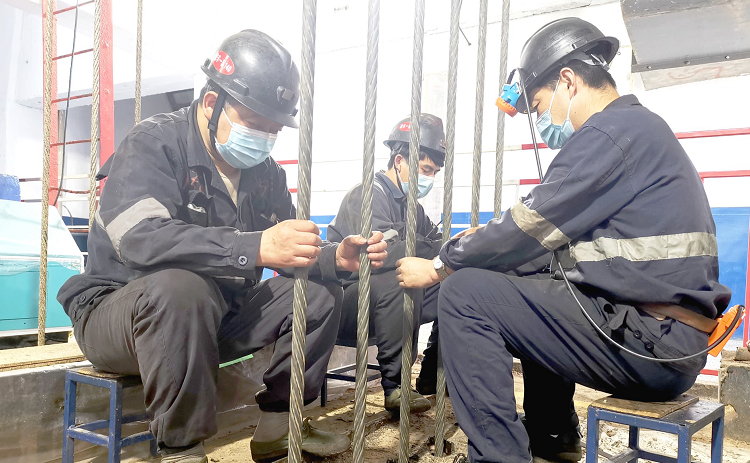 为保证矿井提升系统安全,煤业公司潘二矿坚持以预防为主,加强对提升设备的检查维护,确保及时发现和消除隐患,实现矿井提升系统安全高效运转。图为该矿绞车一区职工用“目测手捋”的方式对提升钢丝绳进行检修。(侯洋洋 摄)