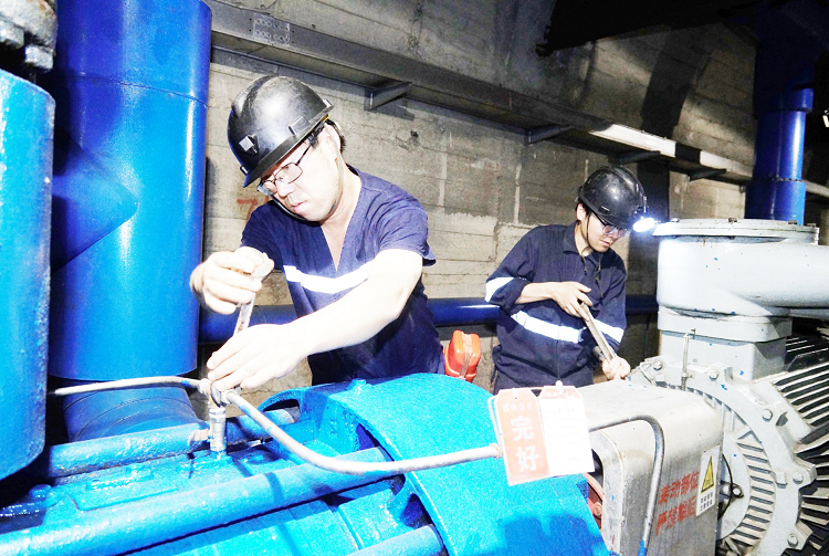煤业公司顾桥矿认真落实集团公司安全生产月活动要求,组织人员对井上井下机电设备进行全面排查,按照“五落实”要求,及时消除隐患,确保投入使用后系统稳定运行、设备正常运转。图为该矿职工在检修井下制冷硐室循环泵系统。(刘喜 摄)