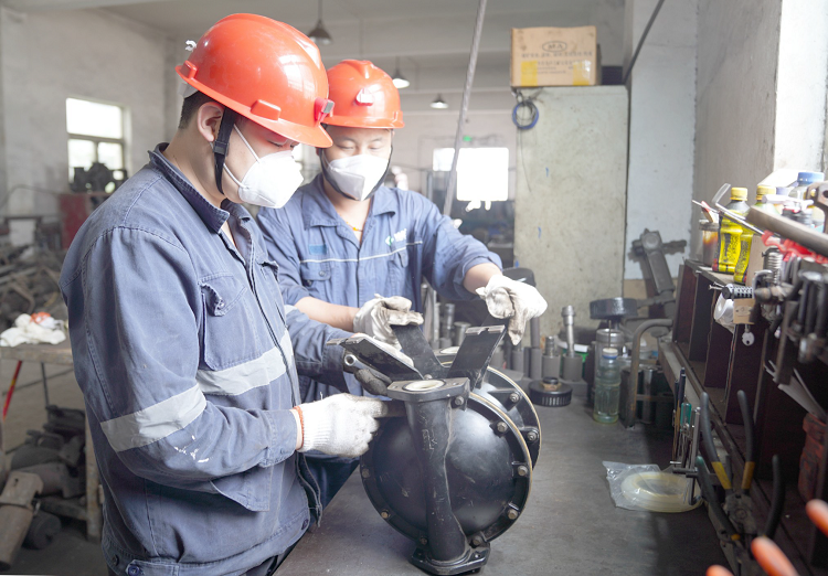淮浙煤电公司顾北矿认真贯彻落实集团公司“两个严防”要求,切实加强设备检修、维护和保养工作,延长设备使用寿命,发挥设备最大效能。图为该矿职工正对气动隔膜泵进行日常维修保养。(万新 摄)