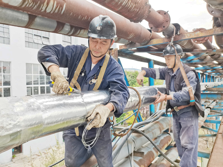 近日,淮南地区气温逐渐降低,为切实做好防冻防寒工作,煤业公司潘二矿组织人员对矿井的供水供暖管路进行保暖预防,避免严寒天气下管路出现冻裂,影响矿井安全生产。图为该矿机电一区大件队职工正在用保温材料对供暖管路进行包扎作业。(尹欣 摄)