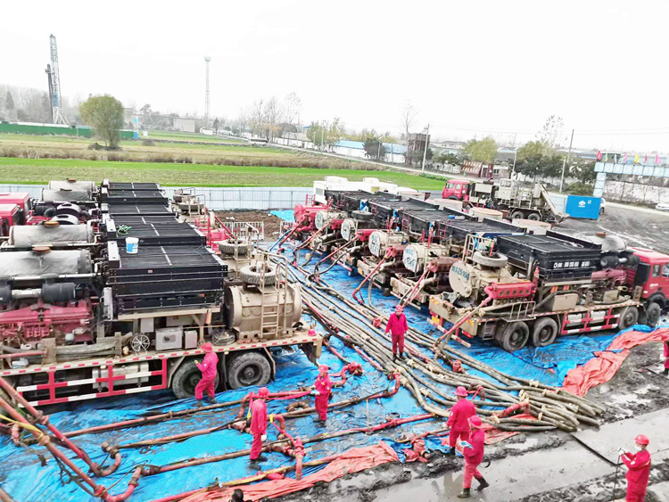 日前,煤层气公司潘三11煤U2(PSU2)瓦斯治理井完成首段压裂施工,拉开U型井压裂施工序幕,为后续该区块压裂工作提供了可靠地质数据打下良好基础。该井完钻井深1850米,水平段长846米,设计分13段压裂施工,现场组织13台压裂泵车同时作业,目前压裂射孔工作正按计划有序开展。图为PSU2井压裂现场。(吴状 夏登洁 摄)