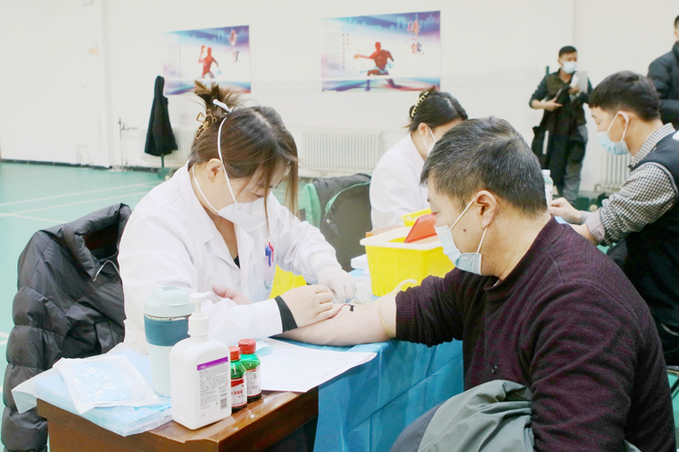 为加强职业病防治,保障职工身体健康,西部煤电集团唐家会矿邀请专业医疗机构人员来矿为职工进行职业体检服务,让职工“足不出户”享受健康体检。图为医生为职工抽血化验。(关超艺 摄)