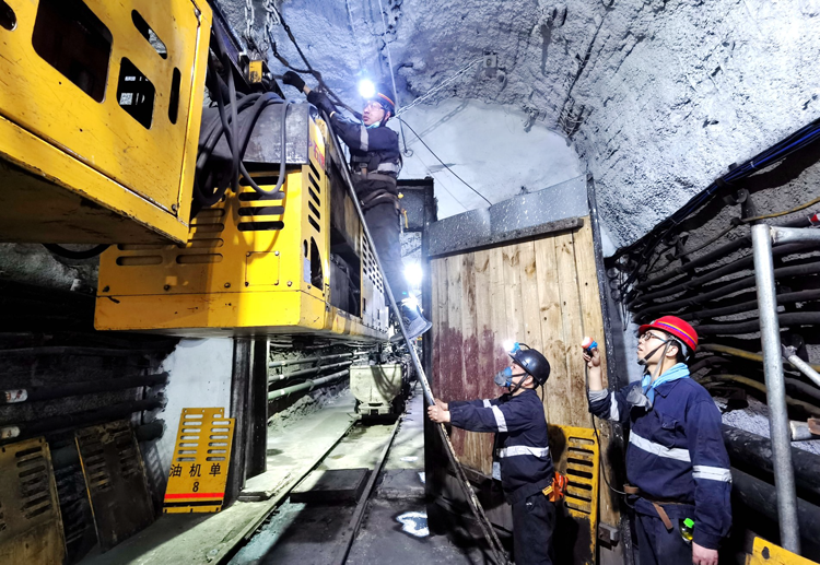 淮浙煤电公司顾北矿认真落实集团公司安全一号文相关要求,加大对柴油单轨吊检查力度,保障柴油单轨吊性能完好、运转正常,提高单轨吊的运转率,确保井下运输平稳有序。图为该矿综采一队检修人员正在对单轨吊进行全面细致检查。(陈恩文 摄 )