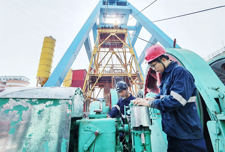 开年以来,集团公司重点建设项目有序推进。淮沪煤电公司丁集矿加强对二水平建设的安全监管,加大井口提升设备检查维护力度,及时排除安全隐患,确保项目建设平稳有序。图为该矿二水平机电安装科职工正在井口检查提升设备安全情况。(孙飞 摄)