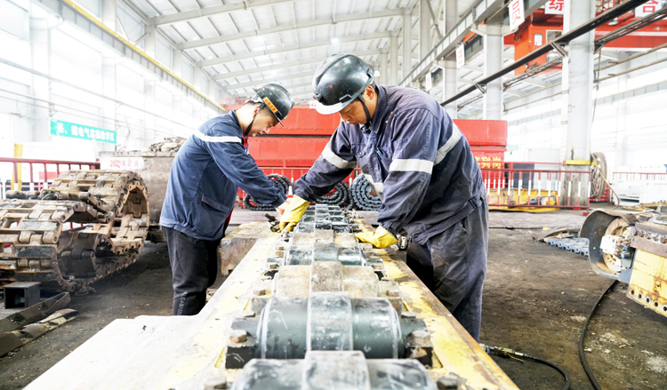 淮沪煤电公司丁集矿认真贯彻集团公司安全一号文相关要求,把抓好大型设备检修作为夯实现场管理的重要环节。进一步提高设备检修精细度,强化检修质量,确保设备正常运转。图为该矿综机工区职工在维修综掘机行走部履带。(胡锦 摄)