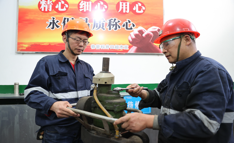 今年以来,煤业公司潘三矿积极贯彻“低成本战略”,严控物资消耗,坚持“有旧不领新”,加大设备修旧利废、回收复用力度,降低成本投入。图为该矿物资管理科职工维修废旧风动工具。(周勇 摄)