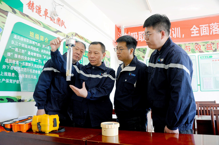 针对青年职工实操经验较少的实际,西部煤电集团唐家会矿通风综合队于近日利用技能大师创新工作室和现有培训设备,打造沉浸式、体验式教学,以此强化职工安全意识,规范操作行为,提升业务能力。图为该队技术骨干向职工讲解DHM2型通风干湿表和空盒气压表原理。(苏旻 摄)