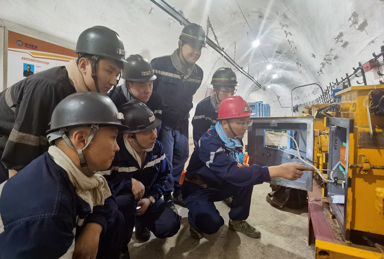 “五一”假期,“全国煤炭行业劳动模范”、集团公司首席技师、淮浙煤电公司顾北矿职工邵桐龄坚守岗位,为青年职工“传经送宝”,为矿井培养技能型人才。图为邵桐龄正在给青工讲解井下隔爆开关内部构造。(陈恩文 摄)