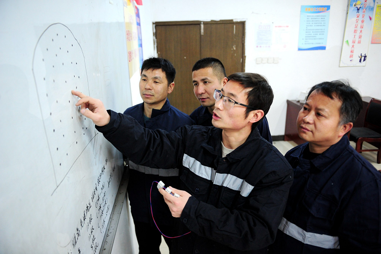 煤业公司朱集东矿大力推行煤矿许用数码电子雷管使用,该雷管操作不仅安全、便捷,而且放炮效率提高30%。目前,数码电子雷管已在该矿全面推广应用。图为在该矿通风区放炮队班前,技术人员正在向职工讲解电子雷管的布置方式。(魏强 摄)