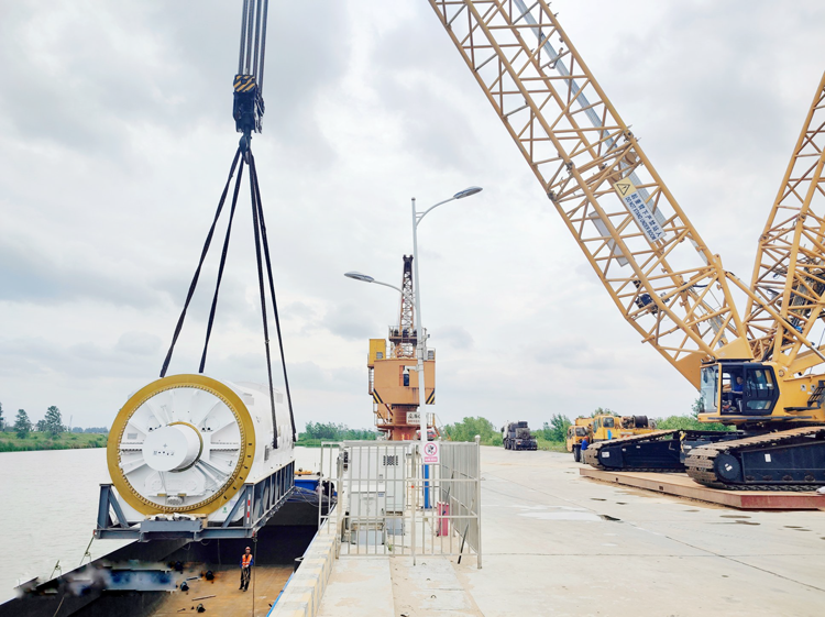 日前,电力集团滁州天然气调峰电厂1号机组发电机顺利吊装就位,标志着1号机组现场安装工作迈入了新的阶段。据悉,本次吊装的发电机长11.534米,宽4.516米,高4.689米,净重约360吨,是所有设备中最重的单体设备,采用额定起重量400吨的行车进行吊装。图为发电机打运现场。(吴越 陈康毅 摄)