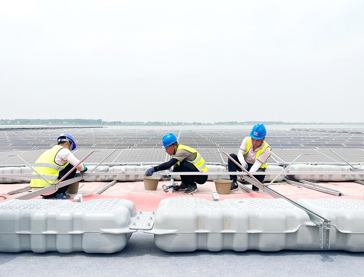 电力集团按照集团公司统筹采煤沉陷区和新能源发展部署,积极将采煤沉陷区打造成绿色能源基地,实现经济、社会和生态效益相统一。图为丁集采煤沉陷区光伏发电项目现场,施工人员正在安装组件支架。(左琦 摄)