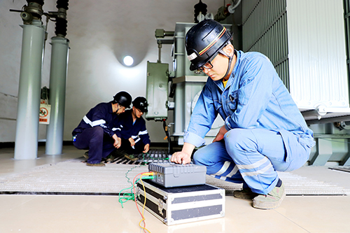 为切实做好雨季防雷工作,近日,煤业公司潘二矿积极联系专业检测机构到矿进行防雷装置安全检测。图为该矿机电二区职工对110kV变电所2#主变接地电阻进行防雷安全测试。 刘辉 摄