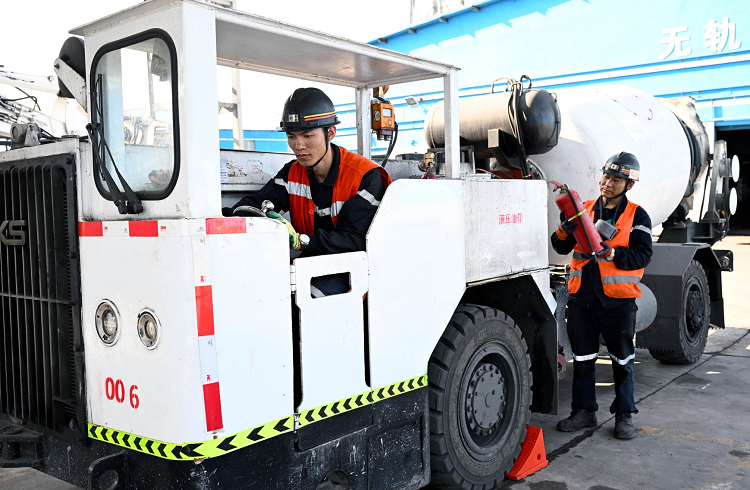 西部煤电集团唐家会矿严格执行胶轮车运行管理规定,要求车辆每次入井前,驾驶人员与检修人员必须对车辆防爆性能、电气系统、制动系统等安全设施进行全方位检查。图为该矿调度所胶轮车运输队职工认真检查车辆状况。(苏旻 摄)
