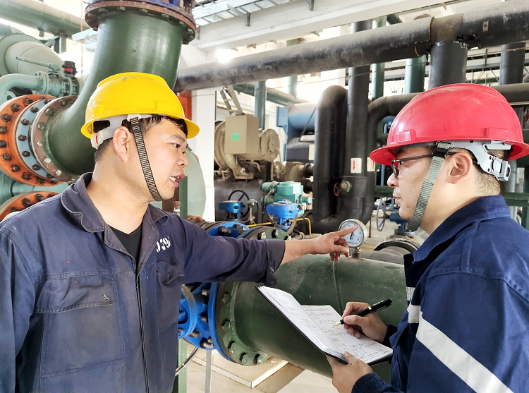 入伏后气温持续走高,为进一步改善井下作业环境,日前,煤业公司谢桥矿组织人员力量,集中对井上井下制冷管路、设备进行全面巡检,及时消除隐患,确保制冷系统安全平稳运行,把凉风送到井下。图为该矿检修人员对地面制冷车间设备运行情况进行巡检。(淮河能源报记者 摄)