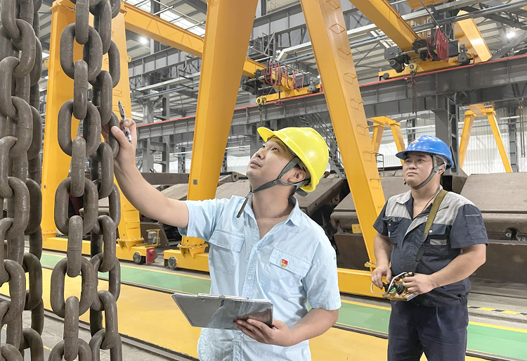 为保证夏季生产安全,煤业公司设备租赁公司保持安全严管态势,加大现场巡查力度,加强对重点区域和关键环节的隐患排查力度,持续做好起吊打运、带压操作等系统的常态化巡检维护。图为该公司工作人员在对行车吊索具进行安全检查。(王艺 摄)