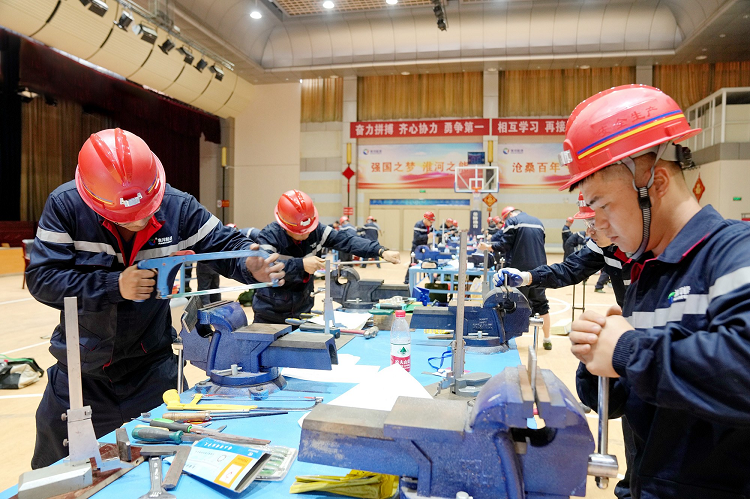 近日,来自煤业公司12家基层单位的41名矿井维修钳工在潘三矿同台切磋技艺,参赛选手们以竞赛活动为平台,积极沟通交流,在互学互鉴中促进技能水平提升。图为矿井维修钳工比赛现场。(张士好 摄)