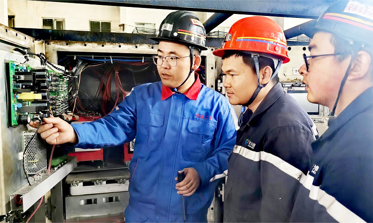 近日,西部煤电集团色连二矿把赵海龙技能大师工作室“搬”到车间现场,因地制宜开设教学课堂,面对面授课,手把手“授艺”,更好地做到理论实践相结合。图为赵海龙(左一)为学员讲解3300V高压变频器控制知识。(郑雅萍 摄