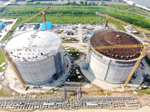 燃气集团锚定重点项目节点目标不放松,在保质量保安全的前提下,全力以赴推进芜湖LNG项目储罐建设,先后顺利完成了2#储罐外罐封顶、1#储罐第一圈内罐壁板合围等重要任务。图为芜湖LNG项目储罐建设现场。 燃气宣
