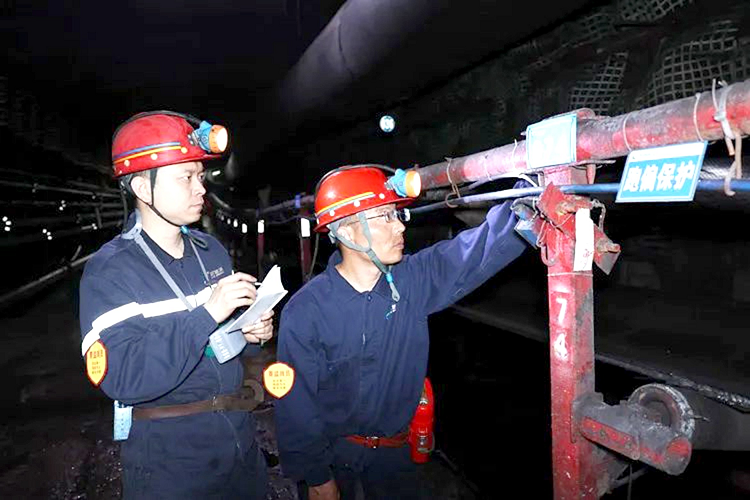 “两节”期间,为确保安全生产,西部煤电集团唐家会矿集中人员力量,对掘进工作面皮带运输机进行隐患排查,及时将隐患消灭在萌芽状态,保障设备安全平稳运行。图为工作人员在对皮带运输机进行隐患排查。(关超艺 摄)