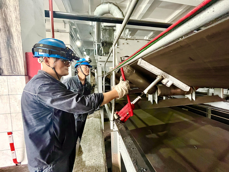 为进一步提高输煤皮带托辊更换工作效率,淮河能源股份顾桥电厂自主创新“重型皮带推举装置”,并在生产实践中有效应用,不仅大大减少了更换工时,还减少了一半人力。图为该厂检修人员正在用该装置将皮带与托辊支架之间推举出间隙,便于托辊更换。(秦建华 范雷 摄)