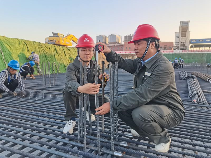 电力集团谢桥电厂项目自开工建设以来,坚持安全第一、质量优先,积极组织人员加强现场巡查,做好质量监督,确保项目建设各工程节点保质保量完成。 图为谢桥发电公司工作人员正在检查汽机房CD间桩头钢筋笼预留高度,确保后续基础钢筋绑扎高度满足要求。 尹欣 孙飞 摄