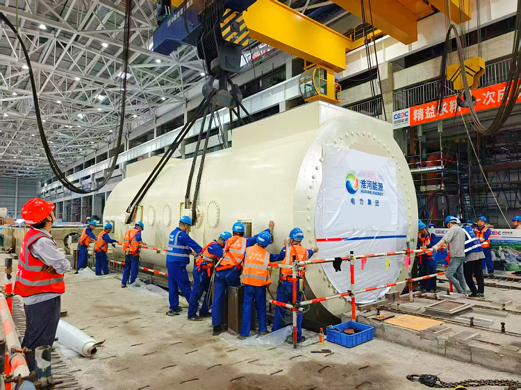 日前,电力集团谢桥电厂2号汽轮发电机定子吊装作业顺利完成。各方精心组织、通力协作,成功将发电机定子精准坐落到汽轮机运转平台机座上。吊装作业的顺利完成,为谢桥电厂实现“双投”打下坚实基础。 图为汽轮发电机定子吊装作业现场。(孙飞 摄)